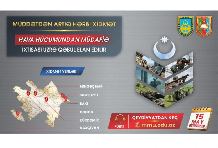 Müdafiə Nazirliyi Hava Hücumundan Müdafiə ixtisası üzrə müddətdən artıq həqiqi hərbi xidmətə sənəd qəbulu elan edir. Sənəd qəbulu mayın 15-dək (bayram və qeyri-iş günləri daxil) elektron qaydada, eyni zamanda, Milli Müdafiə Universitetinin Heydər Əliyev adına Hərbi İnstitutunda (Ünvan: Bakı şəhəri, Xətai rayonu, Polad Həşimov küçəsi 9a) və Əlahiddə Ümumqoşun Ordunun Təlim və Tədris Mərkəzində (Ünvan: Naxçıvan şəhəri, “Naxçıvan-1” hərbi şəhərciyi) saat 09:00-dan 17:00-dək həyata keçiriləcək (şənbə, bazar və bayram günləri istisna olmaqla). Namizədlərin yuxarıdakı üsullardan hər hansı biri vasitəsilə sənədlərini təqdim etmələri yetərli hesab olunur.