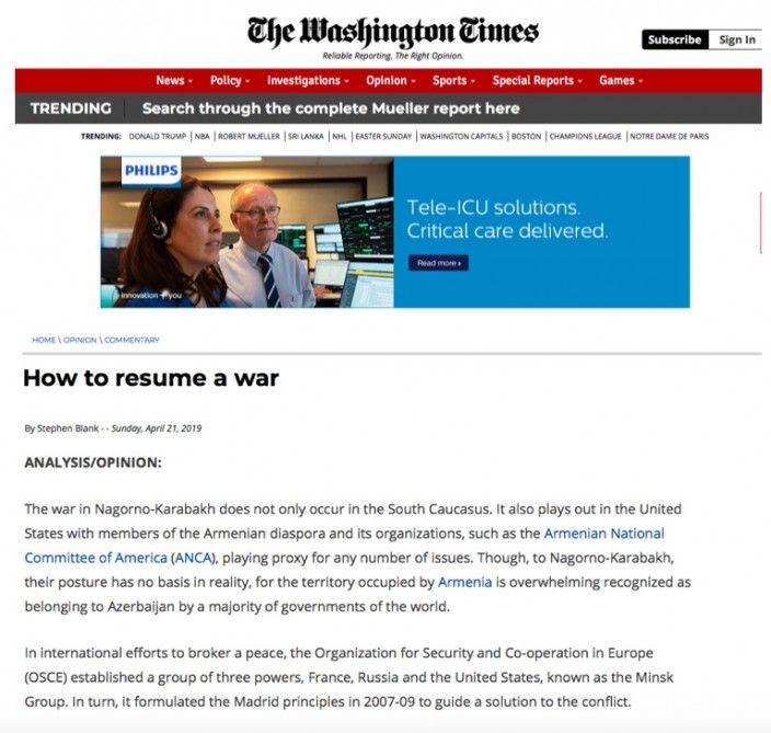 “Washington Times” qəzetində Amerika Xarici Siyasət Şurasının baş elmi işçisi, doktor Stiven Blankın Amerika Erməni Milli Komitəsinin (ANCA) Ermənistanla Azərbaycan arasında danışıqlar prosesinə xələl gətirmək cəhdlərindən və ümumilikdə, Ermənistanın siyasi müstəqilliyinin olmamasından bəhs edən məqaləsi dərc olunub.