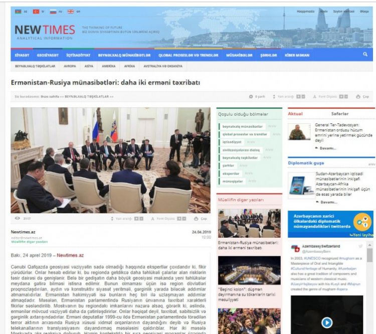 Cənubi Qafqazda geosiyasi vəziyyətin sadə olmadığı haqqında ekspertlər çoxdandır ki, fikir yürüdürlər. Onlar hesab edirlər ki, bu regionda getdikcə daha təhlükəli çalarlar alan risklərin təsir dairəsi də genişlənir. Belə bir gedişatın daha böyük geosiyasi məkanda yeni təhlükələr meydana gətirə bilməsi istisna edilmir. Bunun olmaması üçün isə region dövlətləri proqnozlaşdırılan, aydın və konstruktiv siyasət yeritməli, gərginlik yarada biləcək addımlar atmamalıdırlar. Ermənistan hakimiyyəti isə bunların heç biri ilə uzlaşmayan addımlar atmaqdadır. Məsələn, Ermənistan parlamentində Rusiyanın ünvanına təxribat xarakterli fikirlər səsləndirilib. Moskvanın bu regiondakı imkanlarını nəzərə alsaq, görərik ki, əslində, ermənilər mövcud vəziyyəti daha da çətinləşdirirlər. Onlar həqiqət deyil, təxribat, sabitsizlik və gərginlik axtarışındadırlar. Erməni deputatlar 1999-cu ildə Ermənistan parlamentində törədilən terror aktının arxasında Rusiya xüsusi xidmət orqanlarının dayandığını deyib və Rusiya telekanallarının translyasiyasını dayandırmaq məsələsini qaldırıblar. Hər iki məsələ Moskvada əks-reaksiya doğurub. Həmin kontekstdə bir sıra geosiyasi məqamlar üzərində geniş dayanmağı lazım bildik.