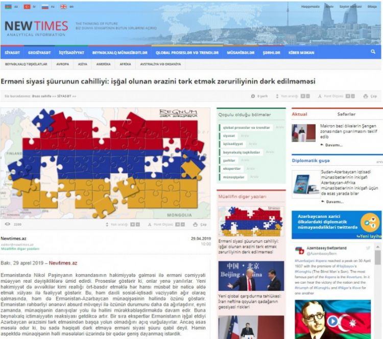 Ancaq onun bu sferada manevr imkanları çox məhdudlaşıb. Rusiya, Avropa və ABŞ ekspert dairələrində rəsmi İrəvanın absurd mövqeyi haqqında açıq yazırlar (bax: məs., Stephen Blank. How to resume a war / "The Washington Times", 21 aprel 2019). Müəllif aydın ifadə edir ki, Ermənistan işğal etdiyi torpaqlardan çəkilmək əvəzinə müxtəlif bəhanələr uydurur, bununla da problemin sülh yolu ilə həllinə ciddi zərbə vurur. Məsələ danışıqlar formatının dəyişməsi ilə deyil, Ermənistan işğalçı qüvvələrinin Azərbaycan ərazisindən çıxması ilə həll oluna bilər.