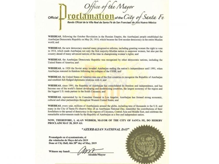 ABŞ-ın Nyu Meksika ştatının paytaxtı Santa Fe şəhəri 28 may 2019-cu il tarixini “Azərbaycan Milli Günü” elan edib. Bununla bağlı şəhər meri Alan Veber (Alan M. Webber) tərəfindən müvafiq bəyannamə imzalanıb.