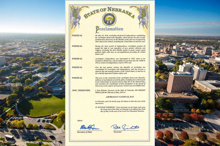 ABŞ-ın Nebraska ştatının qubernatoru Pit Rikets Azərbaycan Demokratik Respublikasının 101-ci ildönümü ilə əlaqədar olaraq rəsmi bəyannamə imzalayıb.