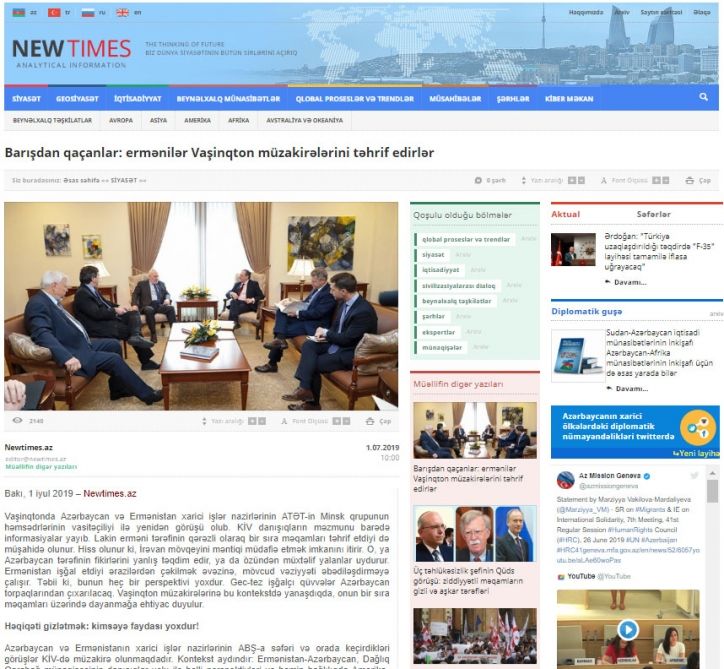 Vaşinqtonda Azərbaycan və Ermənistan Xarici İşlər nazirlərinin ATƏT-in Minsk qrupunun həmsədrlərinin vasitəçiliyi ilə yenidən görüşü olub. KİV danışıqların məzmunu barədə informasiyalar yayıb. Lakin erməni tərəfinin qərəzli olaraq bir sıra məqamları təhrif etdiyi də müşahidə olunur. Hiss olunur ki, İrəvan mövqeyini məntiqi müdafiə etmək imkanını itirir. O, ya Azərbaycan tərəfinin fikirlərini yanlış təqdim edir, ya da özündən müxtəlif yalanlar uydurur. Ermənistan işğal etdiyi ərazilərdən çəkilmək əvəzinə, mövcud vəziyyəti əbədiləşdirməyə çalışır. Təbii ki, bunun heç bir perspektivi yoxdur. Gec-tez işğalçı qüvvələr Azərbaycan torpaqlarından çıxarılacaq. Vaşinqton müzakirələrinə bu kontekstdə yanaşdıqda, onun bir sıra məqamları üzərində dayanmağa ehtiyac duyulur.