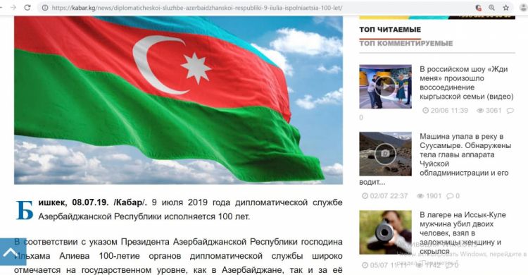 Qırğızıstanın “Kabar” Milli İnformasiya agentliyi ölkəmizin Qırğızıstandakı səfirliyinin təşəbbüsü ilə Azərbaycan diplomatiyasının 100 illiyi ilə bağlı məqalə yayıb.