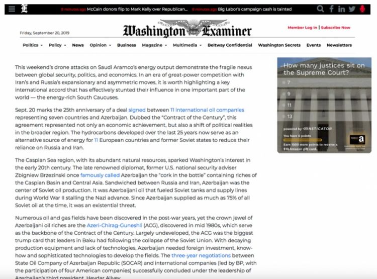 Amerikanın “Washington Examiner” jurnalında siyasi icmalçı Covanni Visente Romeronun “Əsrin müqaviləsi”nin imzalanmasının 25 illiyinə həsr olunmuş məqaləsi dərc edilib.