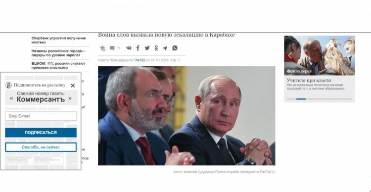 Materialda Prezident Vladimir Putinin Yerevana səfərinin yekunlarını və Avrasiya Ali İqtisadi Şurasının iştirakçıları olan dövlət başçılarının görüşündə iştirakı şərh edilərək, erməni politoloqu Beniamin Matevosyanın sözləri sitat gətirilir. Matevosyan Ermənistan KİV-lərinə müsahibəsində deyib: “Nikol Paşinyanın Vladimir Putinlə “Dvin” mehmanxanasının restoranında, habelə Yerevanda, Rusiya Prezidentinin Ermənistanın ikinci prezidenti Robert Koçaryanın arvadı Bella Koçaryan ilə görüşdən sonra gəldiyi Zvartnos aeroportunda on dəqiqəlik görüşləri yalnız protokol xarakterli foto və videoçəkilişlərlə məhdudlaşıb. Aşkar görünürdü ki, yığılıb qalmış problemlər müzakirə edilməyib”.