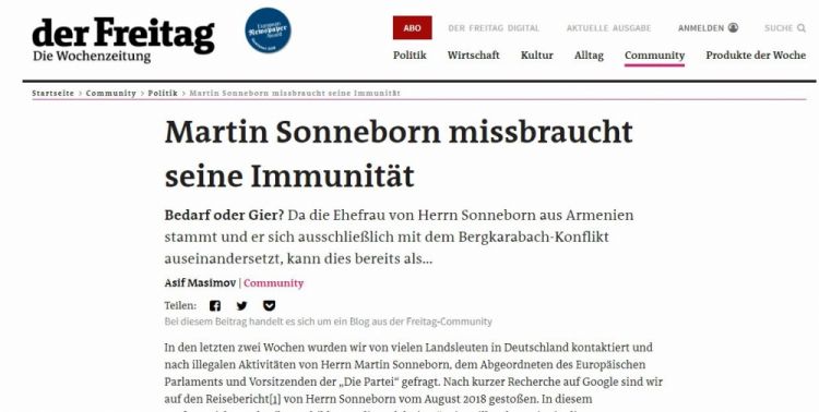 NUHÇIXAN-ın məlumatına görə, Almaniyanın “Der Freitag” qəzetində dərc edilən “Martin Sonneborn immunitetindən sui-istifadə edir” adlı məqalədə beynəlxalq səviyyədə Azərbaycanın ərazisi hesab edilən Dağlıq Qarabağ bölgəsinin 25 ildən artıqdır Ermənistan tərəfindən işğal altında saxlanıldığı nəzərə çatdırılır. Ermənistanın Azərbaycan ərazilərinin 20 faizini işğal etməklə yanaşı, bir milyondan artıq azərbaycanlını öz doğma yurd-yuvalarından didərgin saldığı vurğulanır. Qondarma “Dağlıq Qarabağ respublikası”nın dünyanın heç bir dövləti və ya təşkilatı tərəfindən tanınmadığı bildirilir. Məqalədə Ermənistan-Azərbaycan Dağlıq Qarabağ münaqişəsi ilə əlaqədar Almaniyanın mövqeyi açıqlanır və AFR XİN-ə istinadən Almaniyanın “Dağlıq Qarabağ respublikası” adlı qurumu tanınmadığı qeyd olunur. Atəşkəs xətti boyunca daim atəş səslərinin eşidildiyi, habelə minalanmış ərazi təhlükəsinin olduğu vurğulanır. Avropa Parlamentinin həyat yoldaşı erməni olan deputatı Martin Sonnebornun Ermənistanın maraqlarını müdafiə etməklə məşğul olduğu nəzərə çatdırılır. Deputatın Dağlıq Qarabağa səfəri zamanı Brüsseldə fəaliyyət göstərən erməni lobbi təşkilatı Ədalət və Demokratiya naminə Avropa Erməniləri Federasiyasının prezidenti Kaspar Karampetyan və təşkilatın direktoru Hegvine Evinjan tərəfindən müşayiət olunduğu diqqətə çatdırılır.