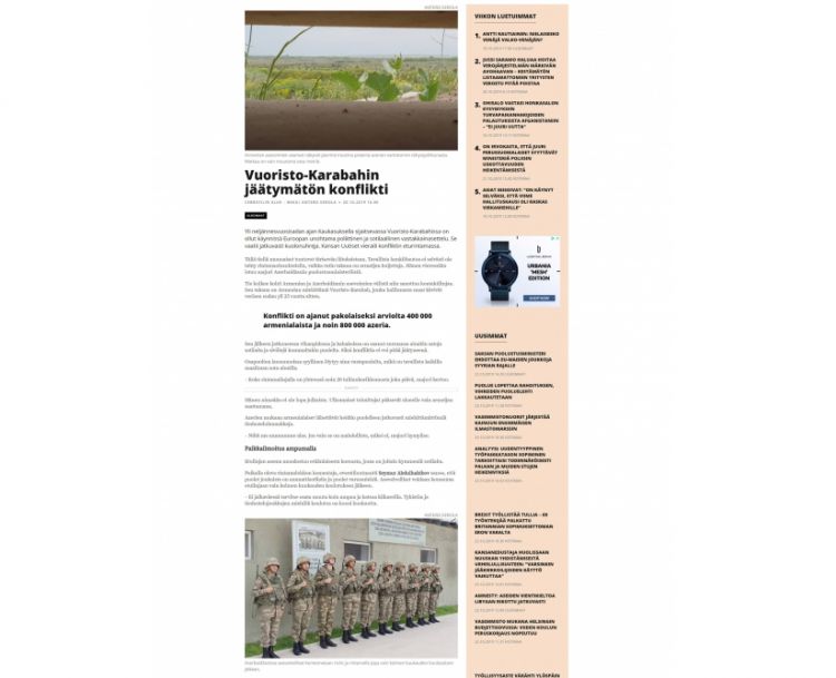 Münaqişə zonasına səfər etmiş jurnalist özünün çətin səfərindən, Ermənistan və Azərbaycan silahlı qüvvələri arasında təmas xəttindəki vəziyyətdən bəhs edərək qeyd edir ki, bu xəttin arxasında Ermənistanın işğalı altında olan Dağlıq Qarabağ bölgəsi yerləşir. Hesablamalara görə, münaqişə nəticəsində 800 minə yaxın azərbaycanlı məcburi köçkünə çevrilib. Hərbi əməliyyatlar zamanı iki tərəfdən minlərlə əsgər və mülki şəxs həlak olub. Fin jurnalist əlavə edir ki, bu səbəbdən münaqişəni “dondurulmuş” hesab etmək olmaz. O, Azərbaycan ordusu zabitinin sözlərindən sitat gətirir: “Cəbhə xəttində hər gün atəşkəs rejimi təxminən 20 dəfə pozulur. Ermənistan silahlı qüvvələri bizim tərəfi gecə saat ikidə və ya üçdə atəşə tutdu. Əlbəttə, biz atəşə cavab verdik”. Hərbi hissəsinin rəisi, mayor Orxan Nəsirov əlavə edir ki, ermənilər mövqeləri doldurmaq üçün adam tapmaqda çətinik çəkirlər və bu səbəbdən öz qüvvələrini atəş bölgəsində cəmləşdirirlər.