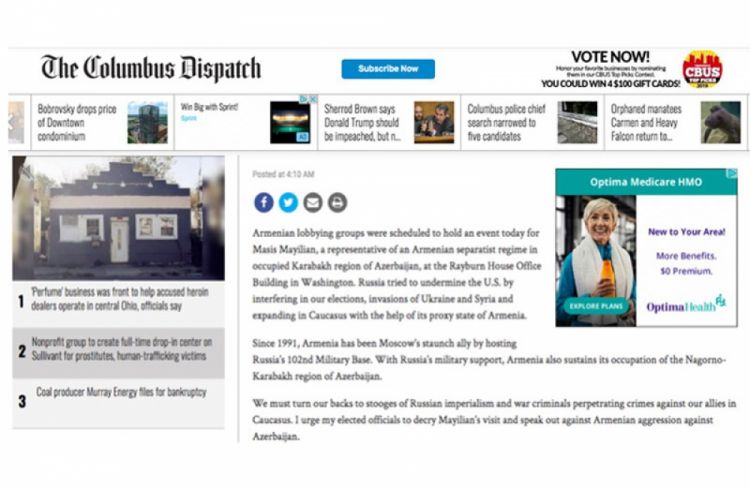 Xatırladaq ki, Azərbaycanın Dağlıq Qarabağ bölgəsinin Xankəndi şəhərinin sakini olan və özünü qondarma rejimin “xarici işlər naziri” kimi təqdim edən Masis Mailiyan Ermənistanın və erməni lobbisinin səyləri nəticəsində baş tutan səfəri zamanı ABŞ Konqresinin Reybörn binasında separatçı rejimi təbliğ edən və Azərbaycan ərazilərinin işğalına dəstək qazanmaq məqsədi daşıyan tədbir keçirməyi planlaşdırır. Bununla əlaqədar ABŞ Azərbaycanlıları Şəbəkəsi Birləşmiş Ştatların qanunvericilərini və yerli mətbuat qurumlarını Ermənistanın Azərbaycana təcavüzü barədə məlumatlandırmaq üçün yazılı kampaniyaya start veriblər. “The Columbus Dispatch” qəzetindəki müraciət də bu kampaniya çərçivəsində dərc olunub.