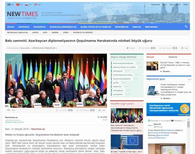 Azərbaycan paytaxtında Qoşulmama Hərəkatına üzv ölkələrin sammiti böyük uğurla başa çatıb. BMT-dən sonra ikinci ən böyük siyasi təsisat olan və fəaliyyətində beynəlxalq hüququn sülh, təhlükəsizlik və əməkdaşlıq məsələlərinə dair əsas prinsiplərini rəhbər tutan Qoşulmama Hərəkatının növbəti sammitinin mövzusu “Bandunq prinsiplərini rəhbər tutmaqla müasir dünyanın çağırışlarına birgə və adekvat cavab verilməsini təmin etmək” olub. Bakı sammitində bütövlükdə 160-a yaxın ölkənin dövlət və hökumət başçıları, həmçinin beynəlxalq təşkilatların rəhbərləri iştirak ediblər. Tədbir iştirakçıları dünyada baş verən böhranları, regional münaqişələri və onların həlli yollarını müzakirə edib, işğal hallarının və dini-irqi ayrı-seçkiliyin aradan qaldırılması yollarından bəhs edib, ölkələrin ərazi bütövlüyünün və suverenliyinin qorunmasını bir daha gündəmə gətiriblər. Bu problemlər Qoşulmama Hərəkatının ənənəsinə və qarşısına qoyduğu məqsədlərə tam uyğundur. Bu baxımdan ekspertlər təşkilatın Bakı sammitini çox uğurlu hesab edirlər.