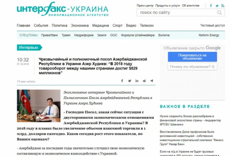 Səfir müsahibəsində Azərbaycanın uğurlu iqtisadi və sosial layihələri, milli şirkətlərimizin Ukraynada investisiya qoyuluşu barədə geniş faktlara əsaslanıb.