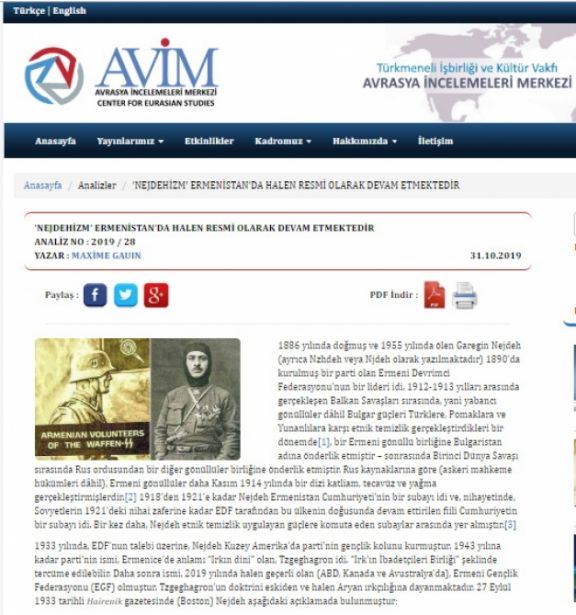 Türkiyədə fəaliyyət göstərən Avrasiya Araşdırmalar Mərkəzinin (AVİM) saytında “Njdeizm Ermənistanda hələ də rəsmi olaraq yaşadılmaqdadır” sərlövhəli elmi məqalə yayılıb.