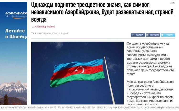 NUHÇIXAN xəbər verir ki, məqalədə bayram günü Azərbaycanda binalardan dövlət bayrağının asıldığı, ölkəmizdə dövlət rəmzinə xüsusi hörmətlə yanaşıldığı bildirilib.