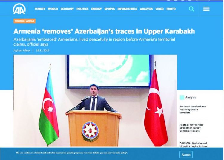 Türkiyənin “Anadolu” agentliyi də “Ermənistan Dağlıq Qarabağdan Azərbaycan izlərini silir” sərlövhəli məqalədə Azərbaycanın Dağlıq Qarabağ bölgəsinin azərbaycanlı icmasının sədri