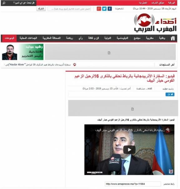 Mərakeş internet mediasında “Ərəb Məğribinin Sədaları” internet jurnalının baş redaktoru Rəşid Moulidin müəllifliyi ilə ümummilli lider Heydər Əliyevə həsr olunmuş məqalələr dərc olunub. Eyni zamanda, “Ərəb Məğribi Sədəları” internet jurnalında səfir Oktay Qurbanovun ümummilli lider Heydər Əliyev və Azərbaycan-Mərakeş münasibətləri haqqında müsahibəsi dərc edilib.