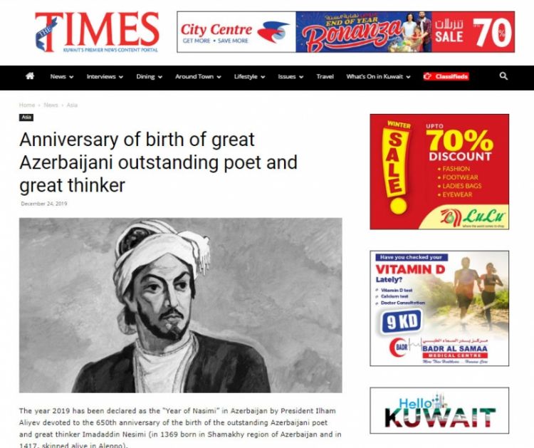 Azərbaycanın Küveytdəki səfirliyinin təşəbbüsü ilə 2019-cu il dekabrın 24-də Küveytdə ingilis dilində həftəlik nəşr olunan “The Times” qəzetində “Nəsimi ili”nə həsr olunmuş məqalə dərc edilib.