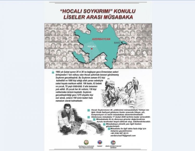 Azərbaycanın Türkiyənin Qars şəhərindəki baş konsulluğunun dəstəyi ilə İğdırdakı məktəblərin şagirdləri arasında Xocalı soyqırımının 28-ci ildönümünə həsr olunmuş hekayə, şeir, bədii kompozisiya və rəsm müsabiqəsi elan edilib.