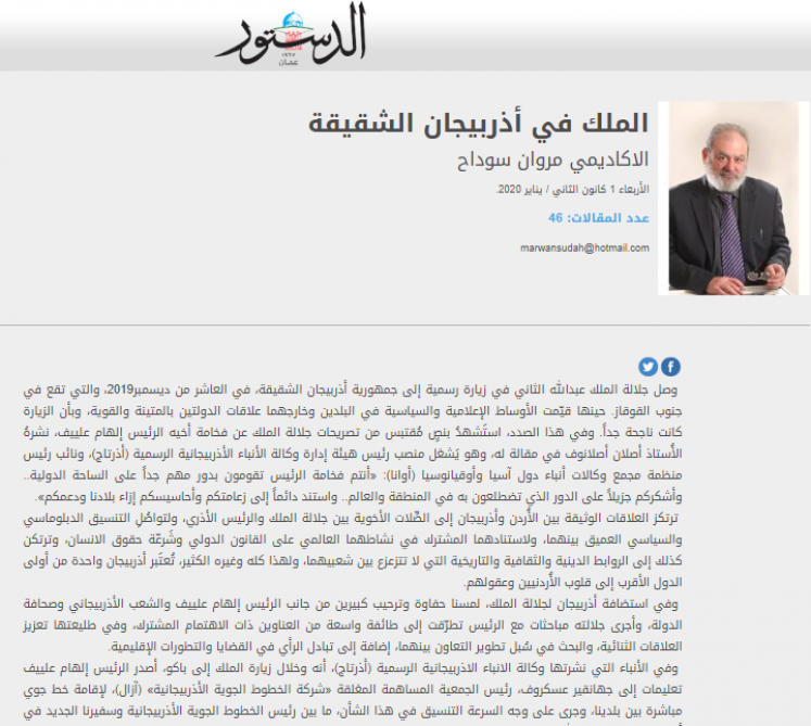Kral II Abdullahın ötən il dekabrın 10-da Azərbaycana rəsmi səfərinin yekunlarına toxunan jurnalist keçirilən görüşlərin və imzalanan müqavilələrin ikitərəfli əlaqələrin daha da inkişafına mühüm töhfə verəcəyini bildirir. Mərvan Sudah məqaləsində, həmçinin Bakı ilə Əmman arasında birbaşa uçuşların təşkili ilə bağlı əldə edilmiş razılığın əhəmiyyətini vurğulayır.