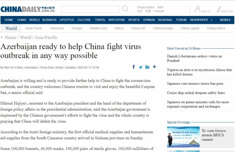 Çinin 100 milyon oxucusu olan “China Daily” qəzetində “Azərbaycan Çinin virus ilə mübarizəsinə hər mümkün yolla kömək etməyə hazırdır” sərlövhəli məqalə dərc olunub.