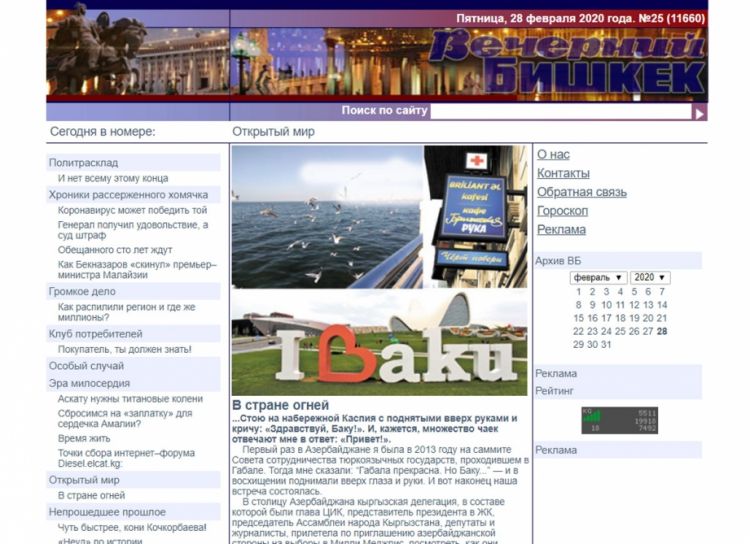 Jurnalist Azərbaycanın paytaxtı, Dənizkənarı Bulvar, şəhərin rəmzləri, qədim İçərişəhər və başqa görməli yerlər barədə təəssüratlarını bölüşüb. O yazır: “Azərbaycanın özünəyetərli, zəngin və təhlükəsiz ölkə olduğunu hiss etmək üçün bir neçə gün orada olmaq kifayətdir. Keçmiş prokurorluq işçisi olmuş bir tanışım hələ Bişkekdə mənə demişdi ki, Bakının küçələrində hətta gecə vaxtı, üstündə bir kiloqram brilyant olduğu vəziyyətdə rahat gəzə bilərsiniz, heç kəs onları əlinizdən almayacaq. Bu sözləri bizə Bakıda da təsdiq etdilər.