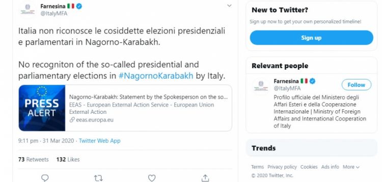 NUHÇIXAN xəbər verir ki, bu bəyanat İtaliya XİN-in rəsmi “Twitter” səhifəsində yerləşdirilib. Bəyanatda deyilir ki, İtaliya Dağlıq Qarabağda keçirilən qondarma “prezident və parlament seçkilərini” tanımır.