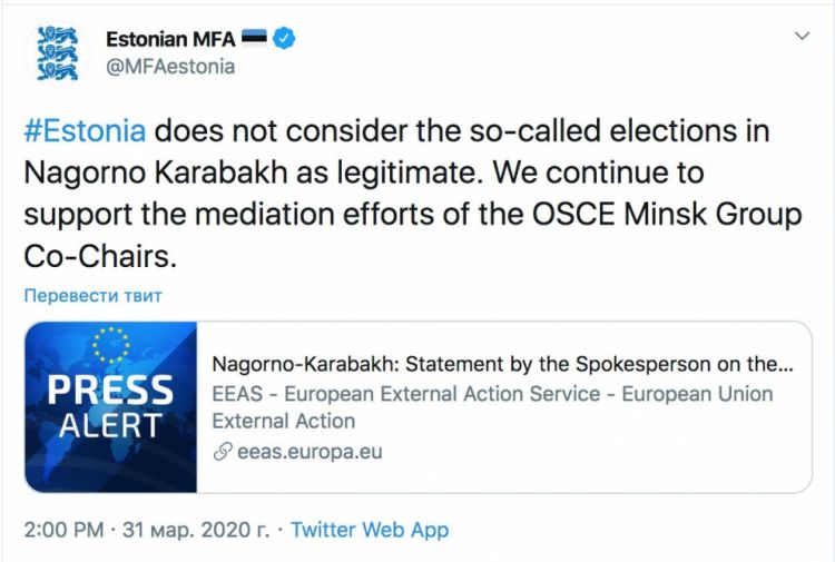 Estoniya Xarici İşlər Nazirliyi Azərbaycanın Ermənistan tərəfindən işğal olunmuş Dağlıq Qarabağ bölgəsində keçirilən qanunsuz “parlament və prezident seçkilərini” tanımadığını bəyan edib.