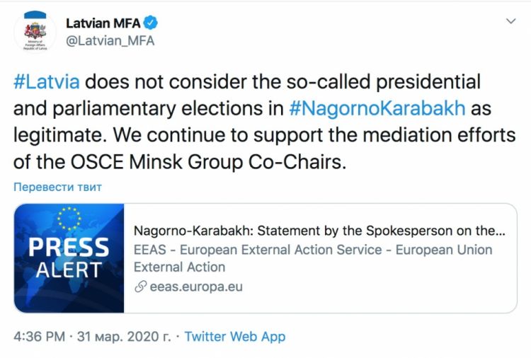 Latviya XİN-in rəsmi “Twitter” hesabında Azərbaycanın Ermənistan tərəfindən işğal olunmuş Dağlıq Qarabağ bölgəsində keçirilən qondarma prezident və parlament seçkiləri ilə əlaqədar bəyanat yayılıb.