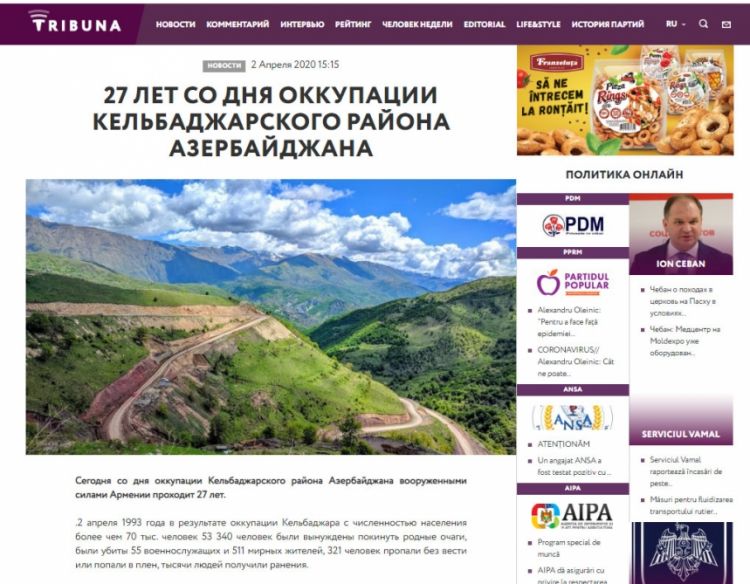 Moldovanın tribuna.md informasiya portalında Azərbaycanın Kəlbəcər rayonunun 1993-cü il aprelin 2-də Ermənistan tərəfindən işğalına dair məqalə dərc edilib.