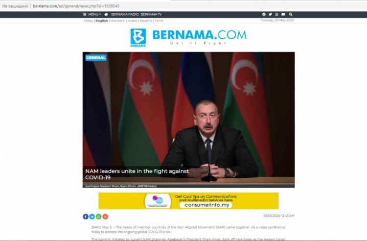 Malayziyanın nüfuzlu BERNAMA agentliyi Azərbaycan Prezidenti, Qoşulmama Hərəkatının sədri İlham Əliyevin təşəbbüsü ilə Hərəkatın Təmas Qrupu formatında mayın 4-də keçirilən “COVID-19-a qarşı birlikdəyik” mövzusunda Zirvə görüşü barədə böyük məqalə yayıb.
