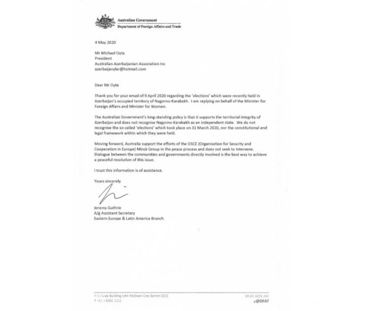 Məktubda deyilir: “Biz 2020-ci il martın 31-də keçirilən saxta seçkiləri, həmçinin onun təşkili ilə bağlı konstitusiya və hüquqi çərçivəni tanımırıq. Bir az da irəli gedərək bildirmək istəyirik ki, Avstraliya ATƏT-in Minsk qrupu çərçivəsində sülh prosesinə göstərilən cəhdləri dəstəkləyir. Proseslə əlaqədar icmalar və hökumətlər arasında keçirilən dialoqu məsələnin sülh yolu ilə həlli üçün ən düzgün yol hesab edir”.