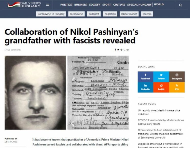 Macarıstanın ingilisdilli populyar “Daily News Hungary” nəşrində Avropa ictimaiyyətini Ermənistanın indiki baş nazirinin babası, “igid” faşist polisi Nikol Vartanoviş Paşinyanın sərgüzəştləri haqqında məlumatlandıran məqalə dərc edilib (bax: https://dailynewshungary.com/news_to_go/collaboration-of-nikol-pashinyans-grandfather-with-fascists-revealed/).