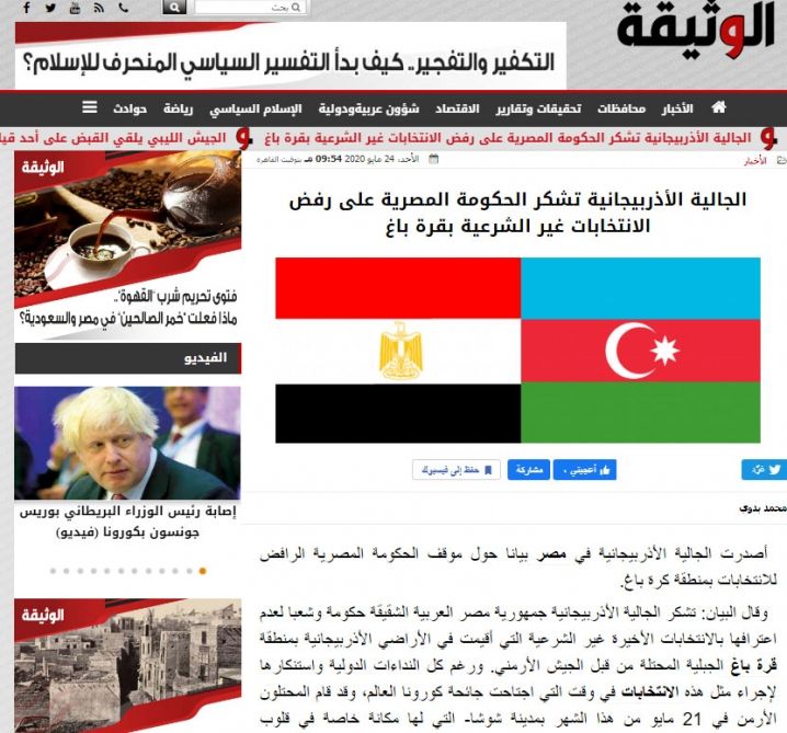 Misirin aparıcı KİV-ləri – “Şbbabalnil”, “Əl-Bavabnews” və “Elvathiqa” portalları Azərbaycanın işğal olunmuş Dağlıq Qarabağ bölgəsində separatçı qondarma erməni rejimi tərəfindən mayın 21-də keçirilmiş “andiçmə mərasimi” ilə bağlı “Vətənpərvər” - Misirdə Azərbaycan Diaspor Təşkilatları Birliyinin sədri, tədqiqatçı-alim Seymur Nəsirovun bəyanatını yayıb.