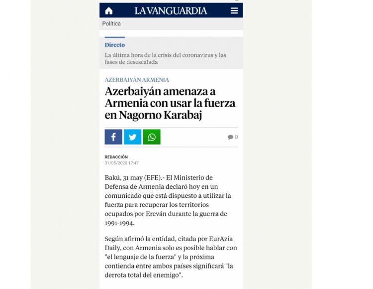 “La Vanguardia” diqqəti 1980-ci illərin sonlarında Ermənistan və Azərbaycan arasında başlanmış Dağlıq Qarabağ münaqişəsi nəticəsində Ermənistan ordusu tərəfindən Dağlıq Qarabağın, həmçinin “təhlükəsizlik zolağı” adlandırılan geniş ərazinin işğal edilməsinə yönəldib. Məqalədə, həmçinin işğal olunmuş ərazilərin BMT-nin qətnamələrinə müvafiq qaydada azad edilməsini Azərbaycanın münaqişənin həllində əsas şərt kimi irəli sürməsi vurğulanıb.