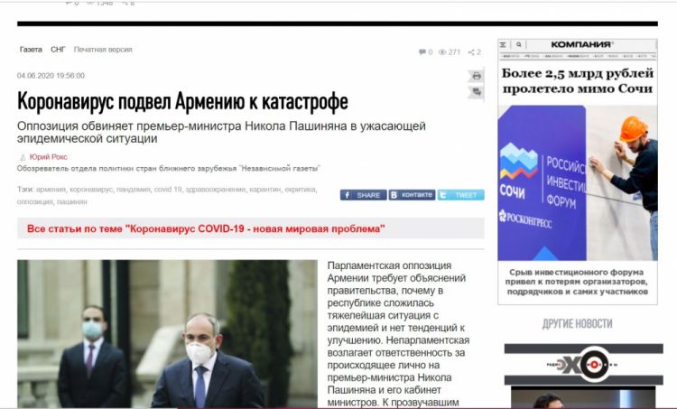 Qəzet yazır ki, Ermənistan parlamentində təmsil olunmayan müxalifət bu vəziyyətə görə şəxsən baş nazir Nikol Paşinyanı və onun hökumətini ittiham edir. Bu Nazirlər Kabinetində əvvəllər işləyənlərin bir qismi də Paşinyanın istefasını tələb edənlərə qoşulub. Özü yüngül formada koronavirusa yoluxmuş baş nazir isə yaranmış təhlükəli vəziyyətə görə məsuliyyəti əhalinin üzərinə yıxır. Onun fikrincə, əhali mövcud vəziyyətə qeyri-ciddi yanaşır və təhlükəsizlik normalarını pozur.