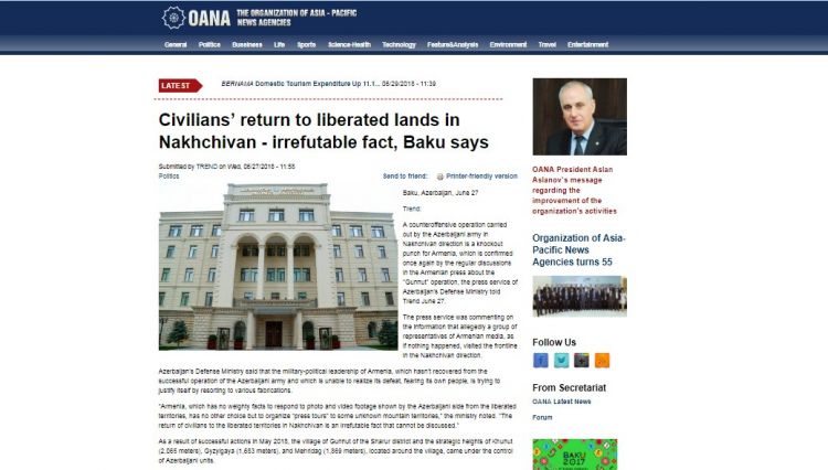 NUHÇIXAN xəbər verir ki, Azərbaycan Respublikası Müdafiə Nazirliyinin “Naxçıvanda azad edilən ərazilərə mülki əhalinin qayıtması artıq müzakirə olunmayan danılmaz faktdır”,- açıqlamasından sonra Asiya və Sakit okean ölkələrinin xəbər agentlikləri təşkilatı – OANA-da eyni adlı başlıqla yazı təqdim olunub. Yazıda qeyd olunub ki , Naxçıvan Əlahiddə Ümumqoşun Ordunun əsgərləri əks-həmlə ilə Günnüt kəndi və onun ətrafındakı 11 min ha ərazini ermənilərin nəzarətindən azad ediblər. Ermənistan tərəfi isə öz məğlubiyyətini xalqdan gizlətməyə çalışır. Son günlər isə bunu pərdələmək üçün bir qrup jurnalisti cəbhə bölgəsinə aparıblar. Yazıda Azərbaycan Respublikası Müdafiə Nazirliyinin buna münasibəti də verilib. “Azərbaycan əsgərinin vurduğu tərs şillədən özünə gələ bilməyən və məğlubiyyəti həzm etmək iqtidarında olmayan Ermənistanın hərbi-siyasi rəhbərliyi xalqının qorxusundan dolayı yollar və müxtəlif uydurmalar hesabına özünə bəraət qazanmağa çalışır. Azərbaycan tərəfinin azad edilmiş ərazilərdən nümayiş etdirdiyi video-foto çəkilişlərə heç bir tutarlı faktla cavab verə bilməyən Ermənistanın məkanı bəlli olmayan hansısa dağlıq ərazilərə “press-tur”lar təşkil etməkdən başqa bir çıxış yolu qalmır. Azərbaycan əsgərinin Naxçıvanda azad etdiyi ərazilərə mülki əhalinin qayıtması, bu yerlərdə həyatın yenidən bərpa edilməsi artıq müzakirə olunmayan danılmaz faktdır”, – deyə Müdafiə Nazirliyindən bildiriblər. İnformasiya agentliyi Günnüt ətrafındakı azad olunmuş yüksəkliklərlə bağlı məlumatlara da yer ayırıb. Saytda Ermənistan-Azərbaycan Dağlıq Qarabağ münaqişəsi, 20 faiz torpaqlarımızın işğalı və Ermənistan Silahlı Qüvvələrinin Dağlıq Qarabağın zorla işğal olunmuş ərazilərindən çıxması ilə bağlı BMT Təhlükəsizlik Şurasının qətnamələri haqda da informasiya verilib.