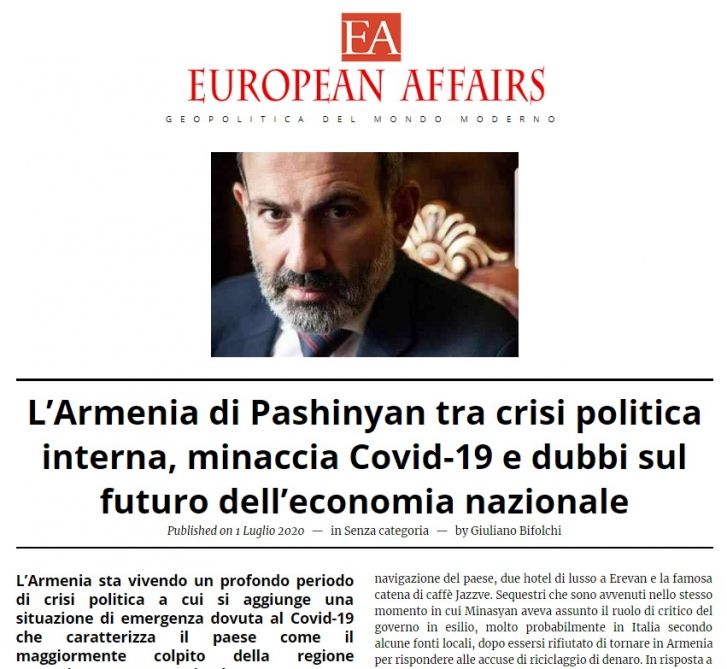 İtaliyanın “European Affairs” onlayn jurnalında italyan jurnalist Culiano Bifolkinin “Paşinyanın rəhbərlik etdiyi Ermənistan daxili siyasi böhran, COVID-19 təhdidi və milli iqtisadiyyatın gələcəyinə şübhələr arasında” adlı məqaləsi dərc olunub.