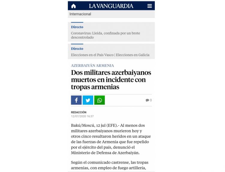 İspaniyanın qocaman nəşrlərindən biri olan “Lа Vanguardia” qəzetində “Erməni ordusu ilə baş verən insidentdə Azərbaycanın iki əsgəri öldürülüb” sərlövhəli məqalə dərc edilib.