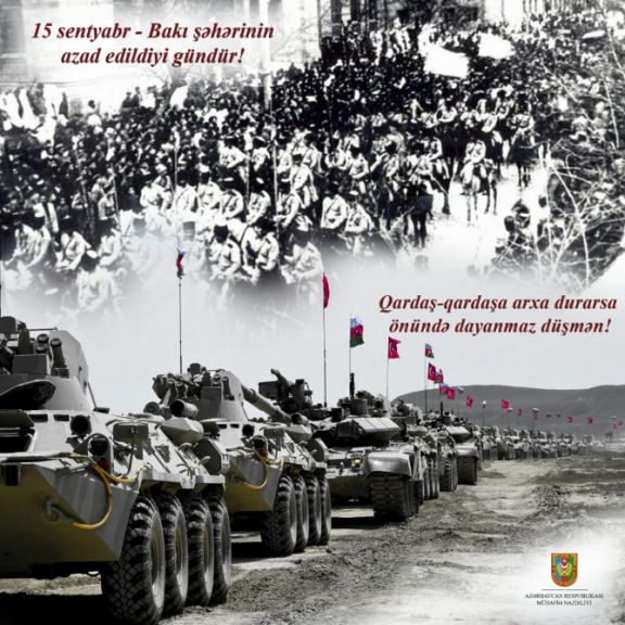 NUHÇIXAN İnformasiya Agentliyi xəbər verir ki, nazirliyin sosial media hesablarında yerləşdirilən infoqrafikada qardaş Azərbaycan və Türkiyə Silahlı Qüvvələrinin möhtəşəm birgə hərbi təlimlərindən çəkilən fotoşəkil nümayiş etdirilib. Təlimlərin əhəmiyyəti ilə yanaşı, qardaşlıq əlaqələrimizin qüdrətini də qabarıq şəkildə nümayiş etdirən infoqrafikada “15 sentyabr – Bakı şəhərinin azad edildiyi gündür!” və “Qardaş-qardaşa arxa durarsa, önündə dayanmaz düşmən!” ifadələri yer alıb.