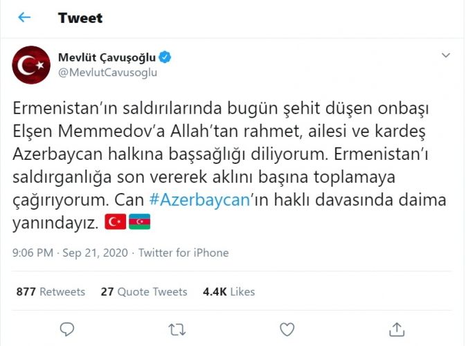 NUHÇIXAN İnformasiya Agentliyi xəbər verir ki, Türkiyə Xarici işlər naziri Mövlud Çavuşoğlu bu sözlərlə Azərbaycan xalqı ilə həmrəyliyini ifadə edib. Nazir yazıb: “Ermənistanı hücumları dayandıraraq, ağlını bağına toplamağa çağırıram. Can Azərbaycanın haqlı mübarizəsində daim yanındayıq”.