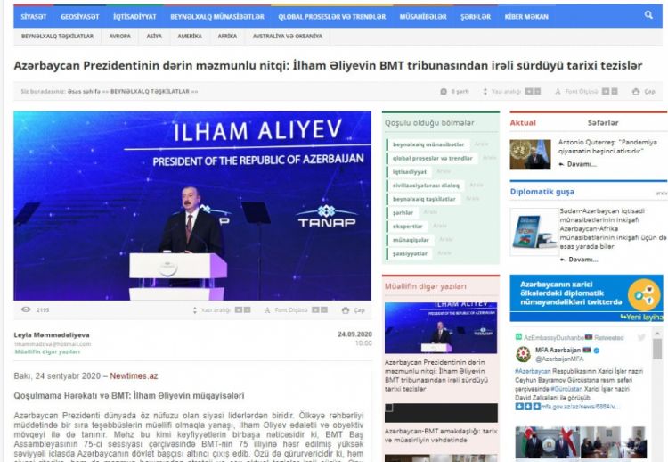 Azərbaycan Prezidenti dünyada öz nüfuzu olan siyasi liderlərdən biridir. Ölkəyə rəhbərliyi müddətində bir sıra təşəbbüslərin müəllifi olmaqla yanaşı, İlham Əliyev ədalətli və obyektiv mövqeyi ilə də tanınır. Məhz bu kimi keyfiyyətlərin birbaşa nəticəsidir ki, BMT Baş Assambleyasının 75-ci sessiyası çərçivəsində BMT-nin 75 illiyinə həsr edilmiş yüksək səviyyəli iclasda Azərbaycanın dövlət başçısı altıncı çıxış edib. Özü də qürurvericidir ki, həm siyasi ritorika, həm də məzmun baxımından strateji və çox aktual tezislər irəli sürüb. Onu ayrıca vurğulamaq gərəkdir ki, Azərbaycan Prezidenti eyni zamanda iki statusda iclasda nitq söyləyib: Qoşulmama Hərəkatının sədri və Azərbaycan Prezidenti kimi! Hər iki statusda çox uğurlu çıxış edib. Dəqiq məntiqə və aydın müddəalara əsaslanan çıxışında beynəlxalq əhəmiyyətli məsələləri lakonik izah edən İlham Əliyev öz təkliflərini irəli sürüb.