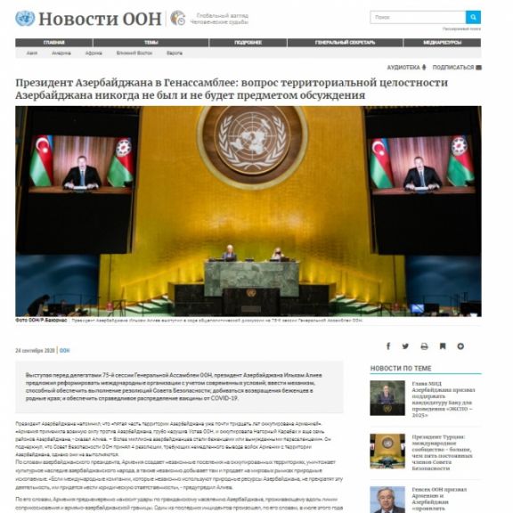 BMT-nin informasiya portalı Azərbaycan Prezidenti İlham Əliyevin Baş Assambleyanın 75-ci sessiyasının ümumi debatlarında videoformatda çıxışını xüsusi xəbər kimi yayıb.