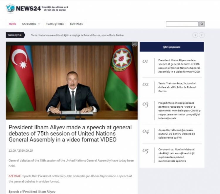 Rumıniyanın “News24hours” portalı Prezident İlham Əliyevin BMT Baş Assambleyasının 75-ci sessiyasının ümumi debatlarında çıxışını dərc edib