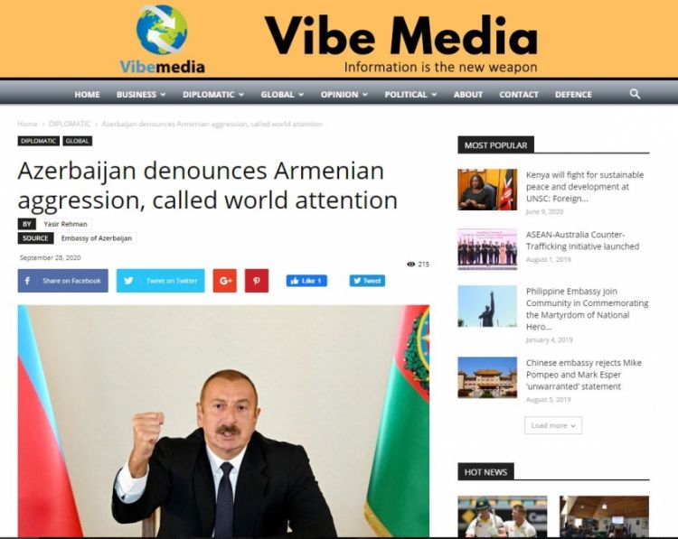 Geniş oxucu auditoriyasına malik vibimedia.net.au portalında yerləşdirilmiş “Ermənistanın işğalçı siyasətini pisləyən Azərbaycan bütün dünyanın diqqətini buna yönəldir” adlı məqalədə vurğulanır ki, Ermənistan silahlı qüvvələrinin cəbhəyanı ərazilərdə sıx şəkildə yaşayan mülki insanları və obyektləri atəşə tutması qəsdən və hədəflənmiş şəkildə həyata keçirilib. Mülki əhali və hərbi qulluqçular arasında həlak olan və yaralananlar barədə məlumatlar var. Çoxsaylı evlərə və mülki obyektlərə ciddi ziyan dəyib.