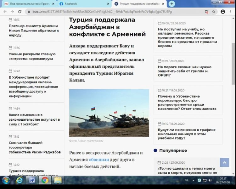 Özbəkistanın kun.uz portalı Ermənistanın təxribatları ilə əlaqədar özbək dilində materiallar verib.