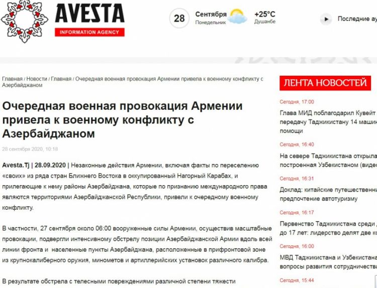 Tacikistanın xəbər portalında Ermənistanın Azərbaycana qarşı növbəti hərbi təxribatı haqqında məqalə dərc edilib