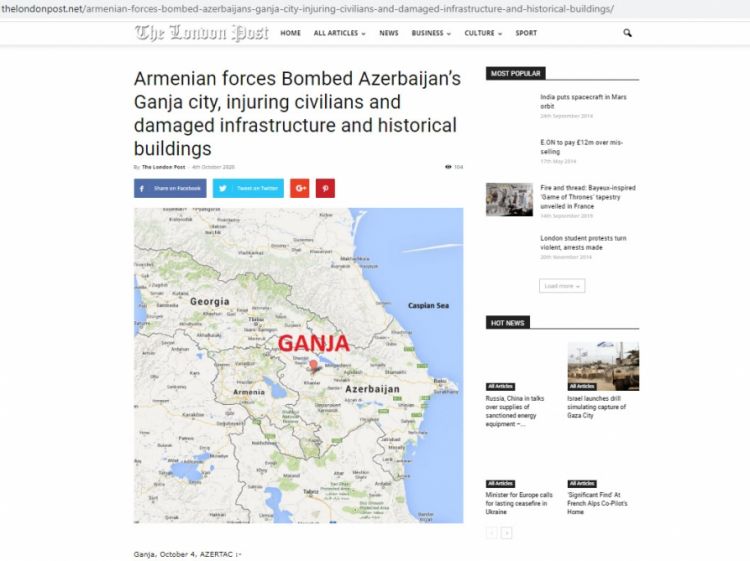 Böyük Britaniyanın “The London Post” informasiya agentliyi Ermənistan ordusu tərəfindən Azərbaycanın ikinci böyük şəhəri Gəncənin raketlər atəşinə tutulması barədə ətraflı məlumat yayıb.