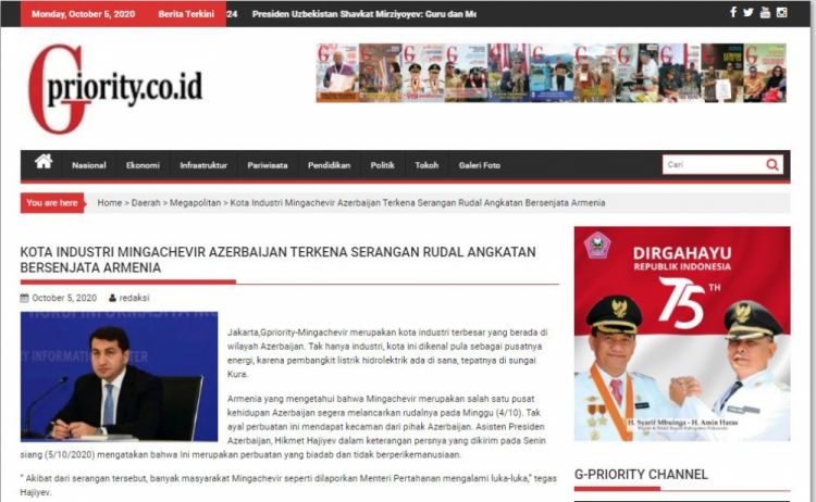 NUHÇIXAN İnformasiya Agentliyi xəbər verir ki, İndoneziyanın nüfuzlu “republika.co.id”, “minanews.net”, “akurat.co.id”, “telusur.co.id”, “gpriority.co.id” və digər saytları Azərbaycan Prezidentinin köməkçisi - Prezident Administrasiyasının Xarici siyasət məsələləri şöbəsinin müdiri Hikmət Hacıyevin “Twitter” hesabındakı həmin sözləri oxucuların diqqətinə çatdırıb.