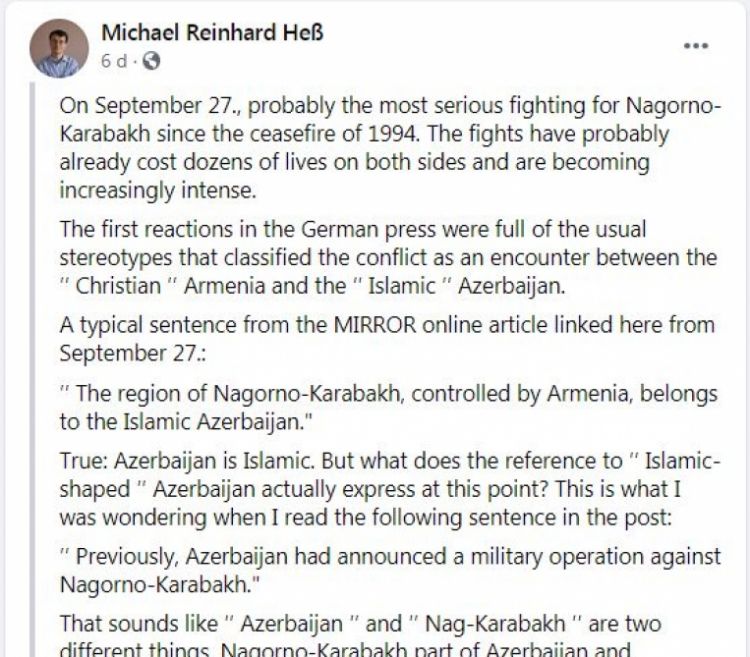 Alman tarixçi, türkoloq, nəsimişünas alim Mixael Raynhard Hess özünün “Facebook” səhifəsində Ermənistan-Azərbaycan Dağlıq Qarabağ münaqişəsinə dair paylaşım edib.
