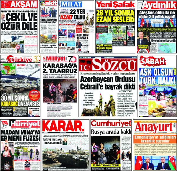 Türkiyə-Azərbaycan dostluğu, qardaşlığı, iki ölkənin həmrəyliyi son günlərdə cərəyan edən proseslər fonunda bir daha təsdiqini tapdı. Belə ki, cəbhə xəttində Ermənistanın təxribatı nəticəsində baş verən hərbi əməliyyatları xüsusi diqqət mərkəzində saxlamasıTürkiyənin dar günün dostu olduğunu, ən yaxın müttəfiqinin dərdini hər zaman bölüşdüyünü, eyni zamanda, qardaş Azərbaycanı heç zaman yalnız qoymayacağını bir daha nümayiş etdirdi. Cəbhədə gedən döyüşlərlə bağlı Türkiyənin aparıcı qəzetləri və xəbər agentlikləri məlumatları operativ şəkildə təqdim edirlər.