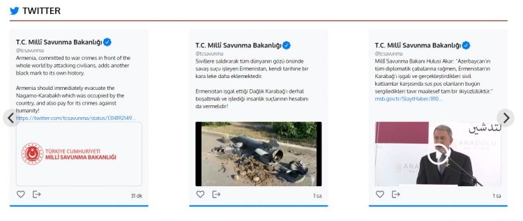 NUHÇIXAN İnformasiya Agentliyi xəbər verir ki, bu ifadə Türkiyə Milli Müdafiə Nazirliyinin rəsmi internet səhifəsində yer alıb. Mətndə əlavə olaraq yazılır: “Ermənistan işğal etdiyi Dağlıq Qarabağı dərhal boşaltmalı və törətdiyi insanlıq cinayətlərinin hesabını verməlidir”.